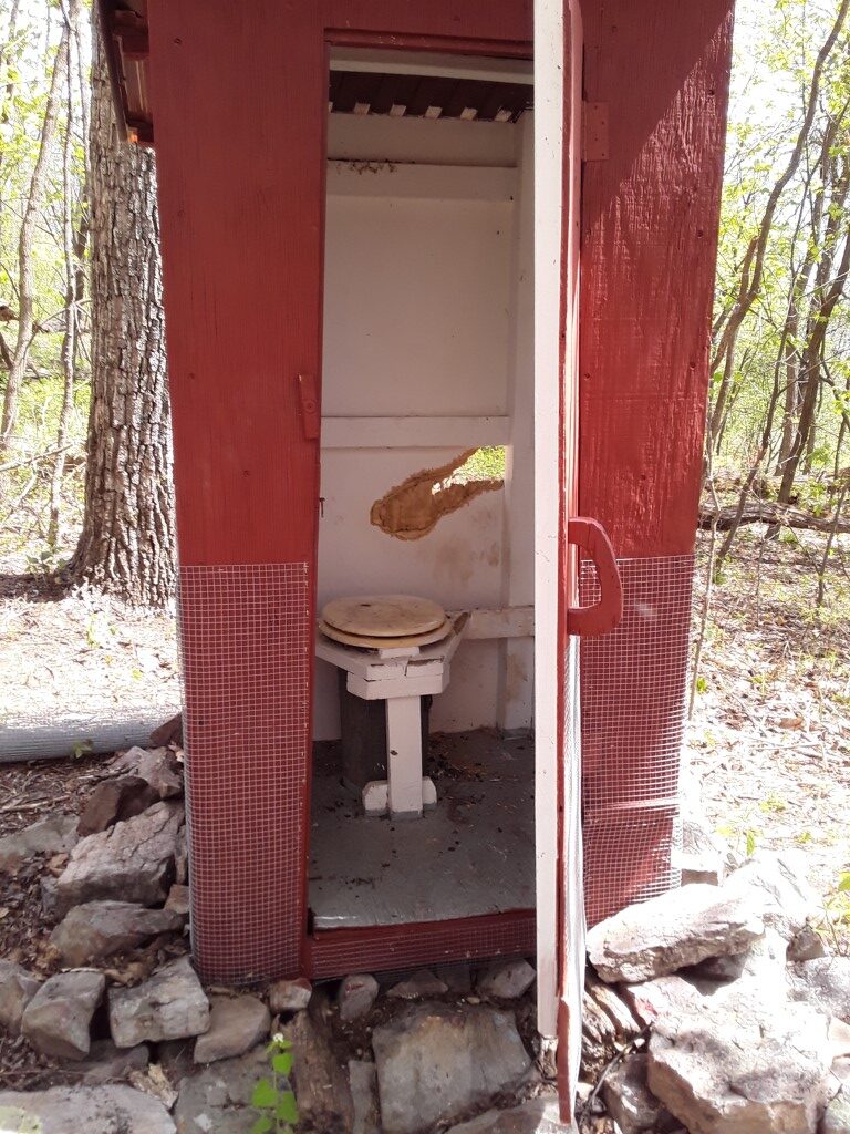 Above: Interior view of a wooden outhouse with porcupine damage.