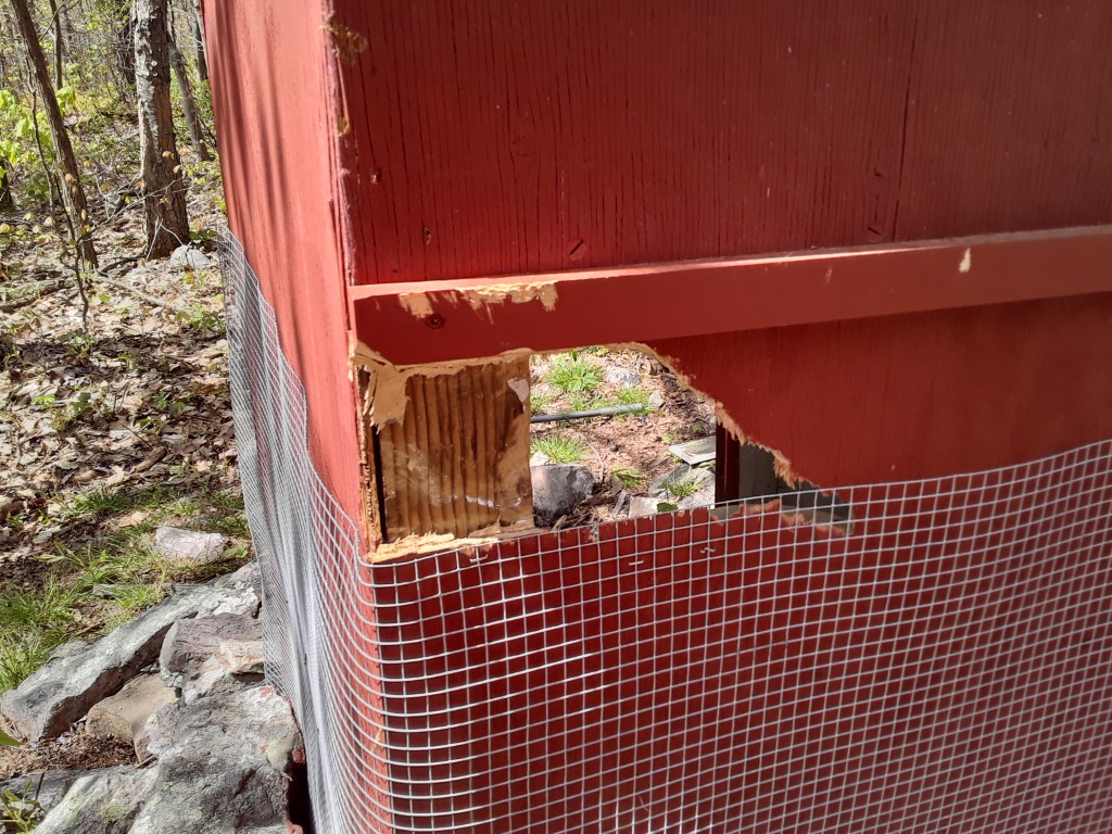 Above: Addition of extra hardware cloth to exterior of outhouse after porcupine damage.